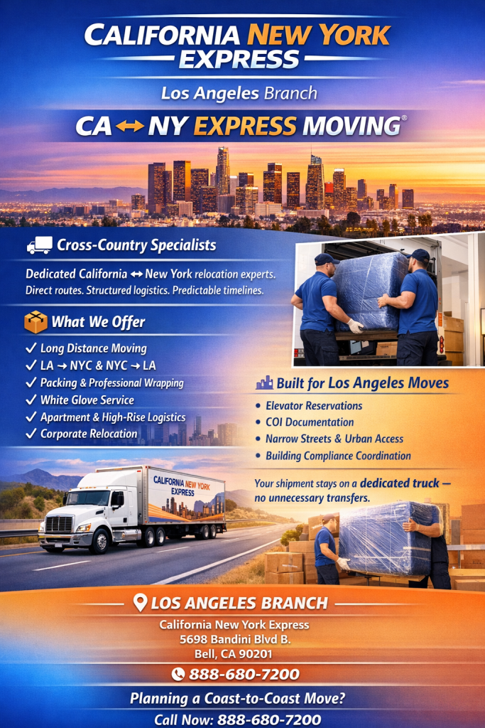 California New York Express operates from its Los Angeles branch in Bell, CA, specializing exclusively in CA ↔ NY routes. Unlike general movers, this is a dedicated cross-country service built around one corridor: California and New York.